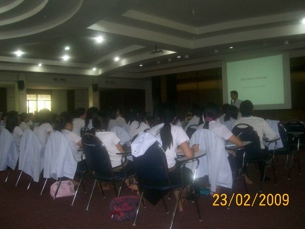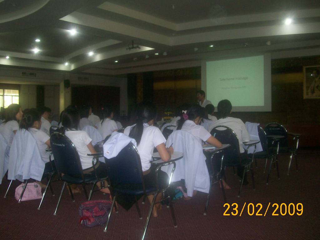งานแพทยศาสตรศึกษา นำโดย รศ.นพ.ป่วนสุทธิพินิจธรรม คณบดี อ.พญ.สรญา แก้วพิทูลย์ ผู้ช่วยคณบดีฝ่ายแพทยศาสตรศึกษา อาจารย์ นักวิชาการ และนักศึกษาแพทยศาสตร์ ได้ร่วมกันจัดงานวิพากษ์หลักสูตรแพทยศาสตรบัณฑิต ระดับ pre-clinic โดยเปิดให้นักศึกษาแพทย์ ชั้นปีที่ 3 (รุ่นแรก) ได้วิพากษ์และเสนอแนะประเด็นสำคัญสำหรับพัฒนาปรับปรุงหลักสูตร เมื่อวันที่ 23 กุมภาพันธุ์ 2552 ณ ห้องประชุมมันปลา วิทยาลัยแพทยศาสตร์ฯ |