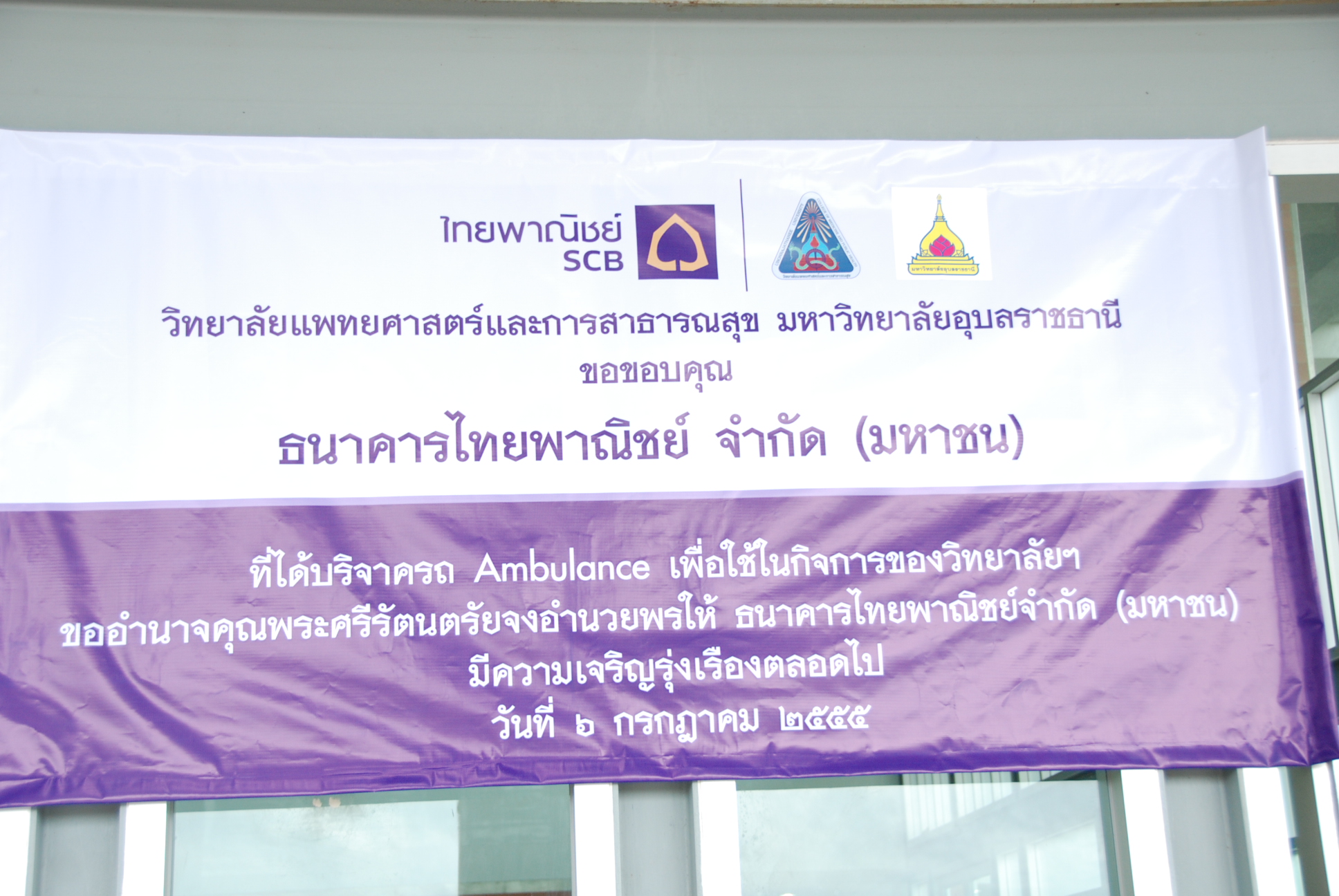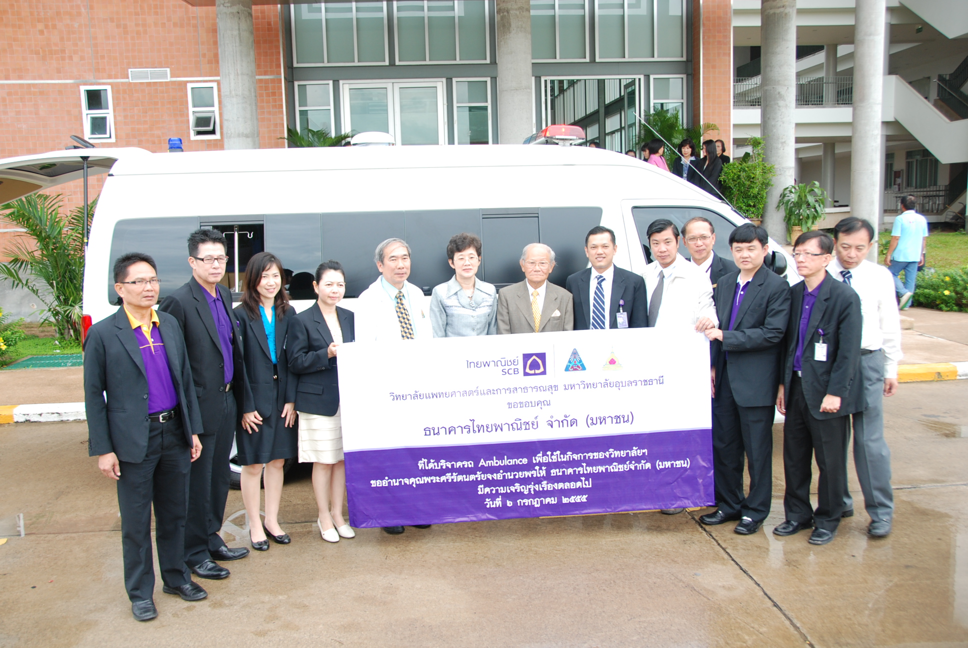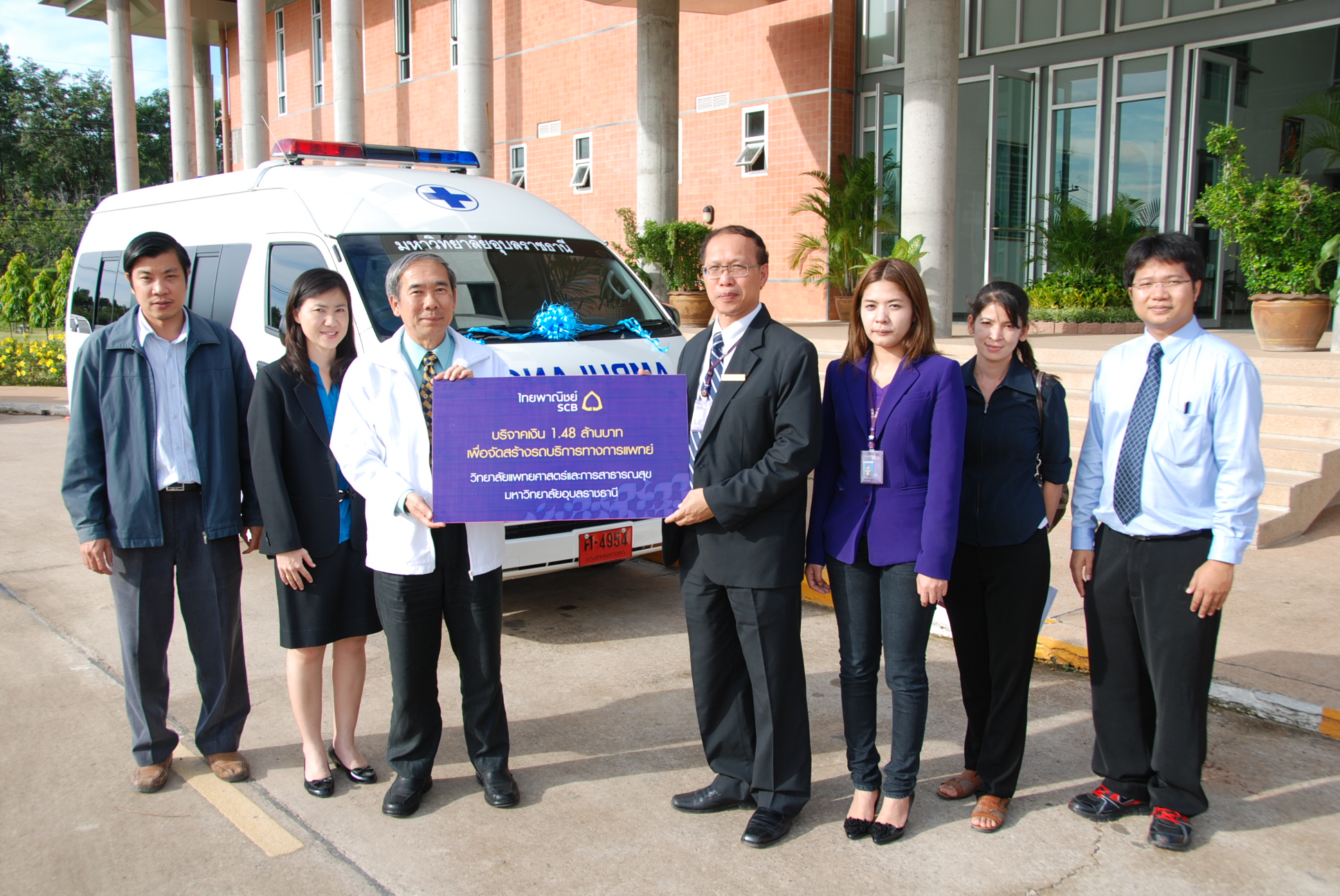 วิทยาลัยแพทยศาสตร์และการสาธารณสุข ได้รับความอนุเคราะห์จากธนาคารไทยพาณิชย์บริจาครถ Ambulance พร้อมอุปกรณ์ภายในให้กับวิทยาลัยแพทยศาสตร์และการสาธารณสุข มหาวิทยาลัยอุบลราชธานี เพื่อรับ ส่งผู้ป่วย ในวันศุกร์ ที่ 6 กรกฎาคม 2555 เวลา 08.45 น. ณ วิทยาลัยแพทยศาสตร์และการสาธารณสุข มหาวิทยาลัยอุบลราชธานี |