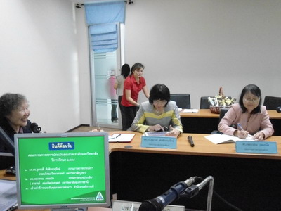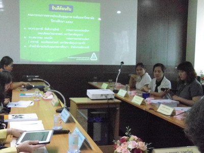 ทางวิทยาลัยฯ นำโดยคณบดี พญ.ชลลดา บุษยรัตน์ (รองคณบดีฝ่ายบริหาร) กล่าวต้อนรับกรรมการฯ และกล่าวรายงานผลการดำเนินงานในรอบปีการศึกษา 2554 ของวิทยาลัยฯ ที่ผ่านมา โดยมีผู้บริหาร เข้าร่วมกิจกรรมดังกล่าว อย่างงพร้อมเพรียง |
