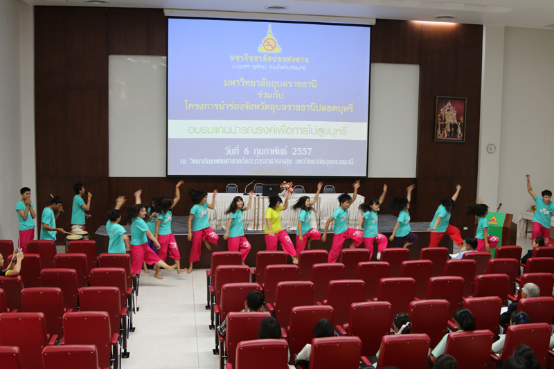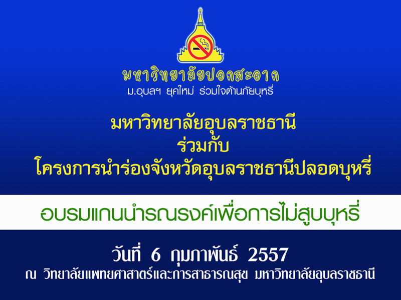 มหาวิทยาลัยอุบลราชธานีร่วมกับโครงการนำร่องจังหวัดอุบลราชธานีปลอดบุหรี่ อบรมแกนนำรณรงค์เพื่อการไม่สูบบุหรี่ โดยได้รับเกียรติจาก นพ.วัฒนา พรรณพานิช รองคณบดีฝ่ายแผนและงบประมาณ วิทยาลัยแพทยศาสตร์และการสาธารณสุข เป็นประธานเปิดโครงการดังกล่าว |